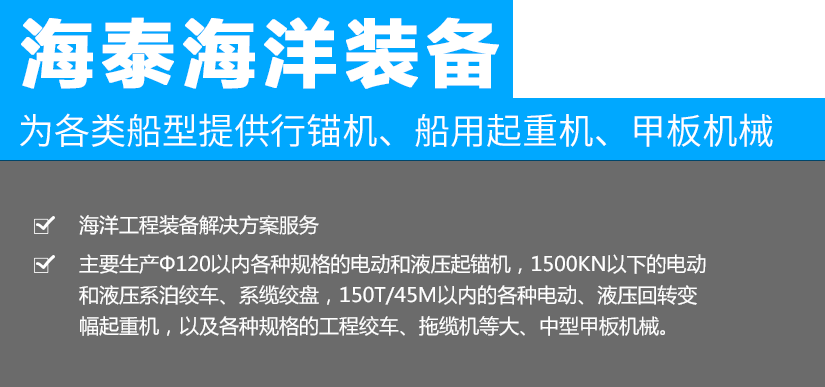 江蘇海泰海洋裝備有限公司位于素稱“銀杏之鄉(xiāng)”的泰興市,2018年投資建設(shè),至今已經(jīng)成為產(chǎn)品研發(fā)、生產(chǎn)制造,調(diào)試服務(wù)為一體的設(shè)備配套企業(yè)。公司從事海洋裝備(設(shè)備)及配件的制造、設(shè)計、安裝,維修;船用錨機、絞車、起重機、舾裝件、電氣設(shè)備、環(huán)保設(shè)備設(shè)計、制造。公司成立以來,就與中國船舶工業(yè)集團公司第701所、702所、704所、708所、上海船舶研究設(shè)計院等多家船舶科研院所建立了技術(shù)合作關(guān)系,產(chǎn)品應(yīng)用于......